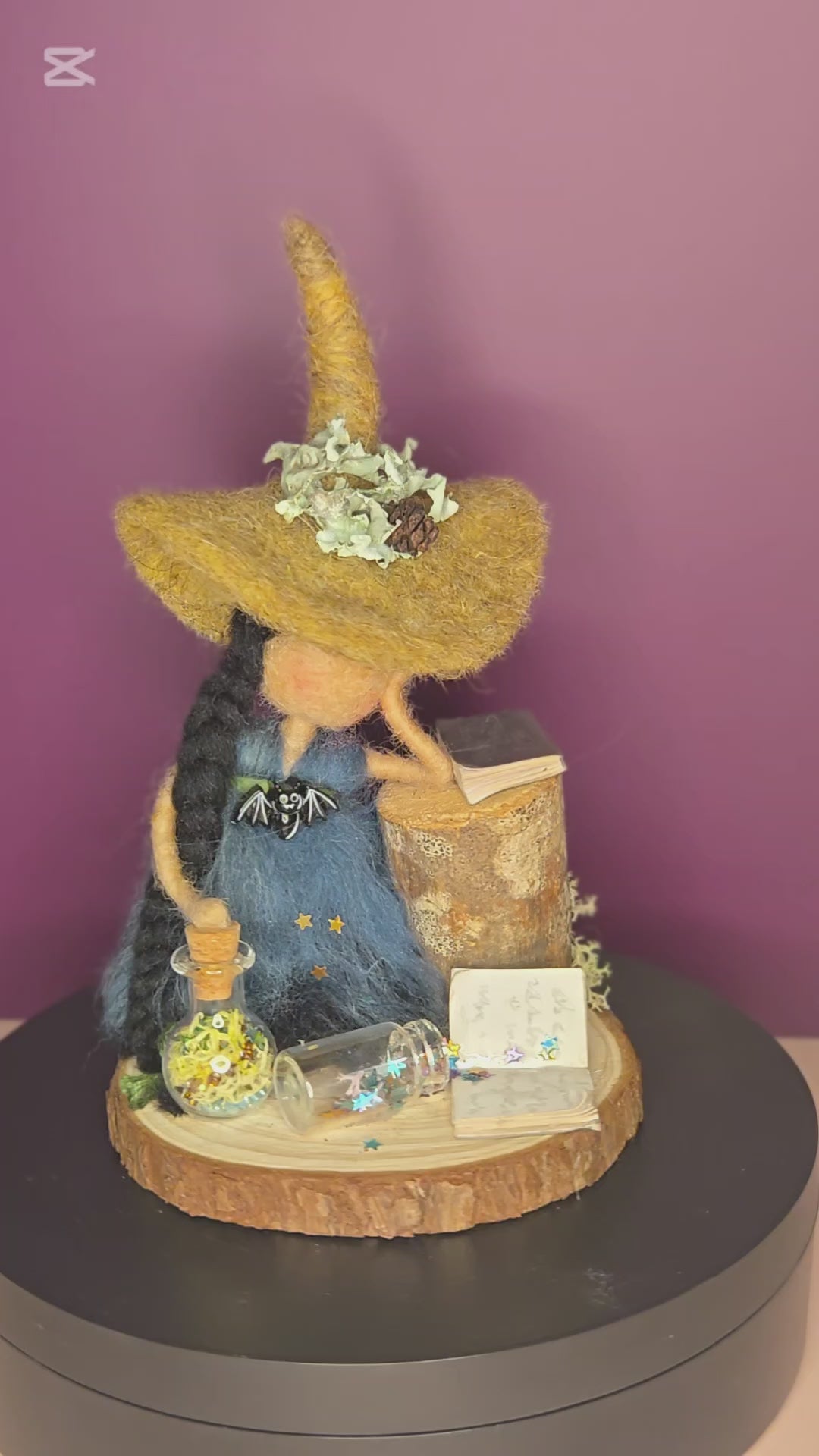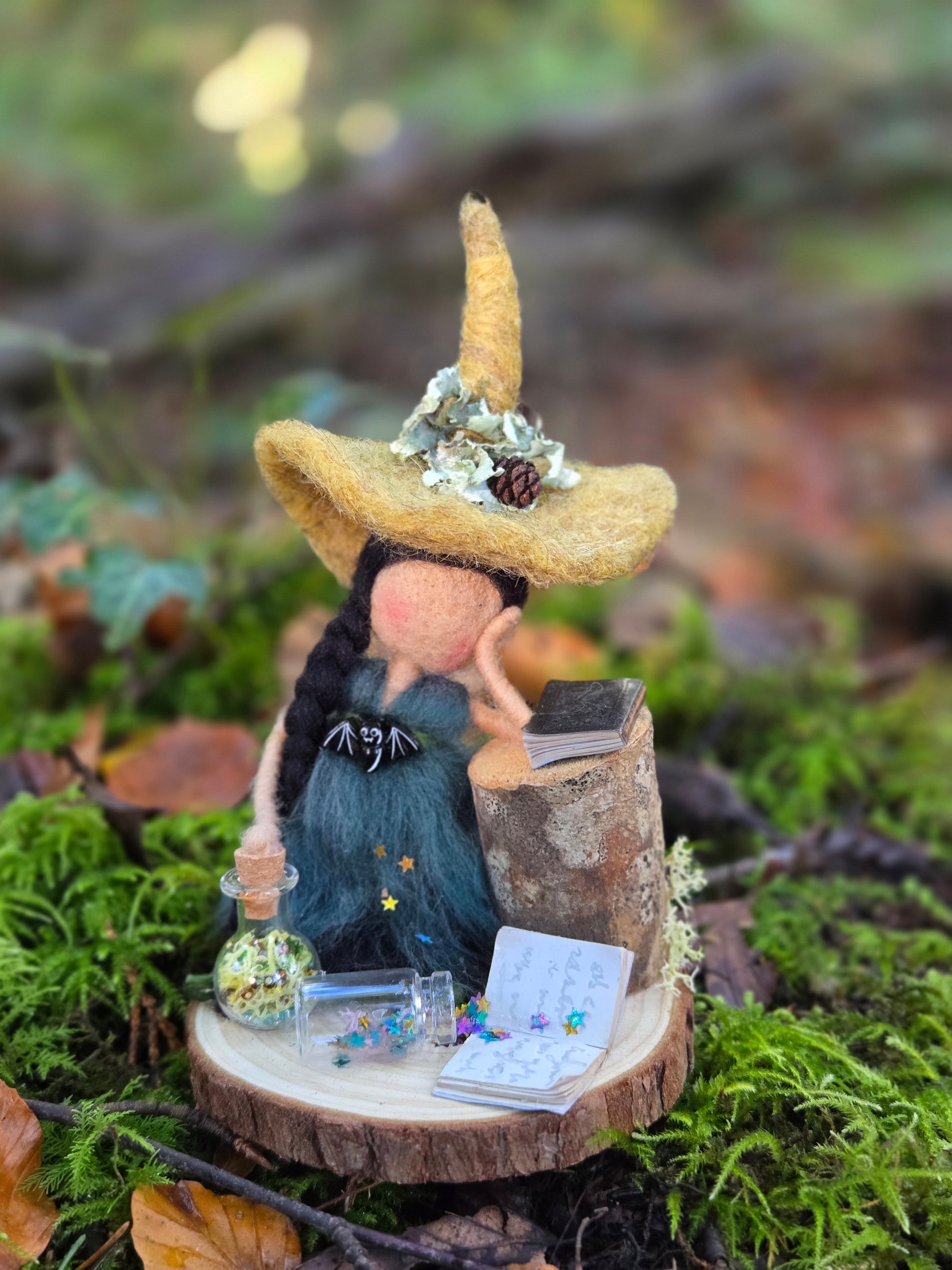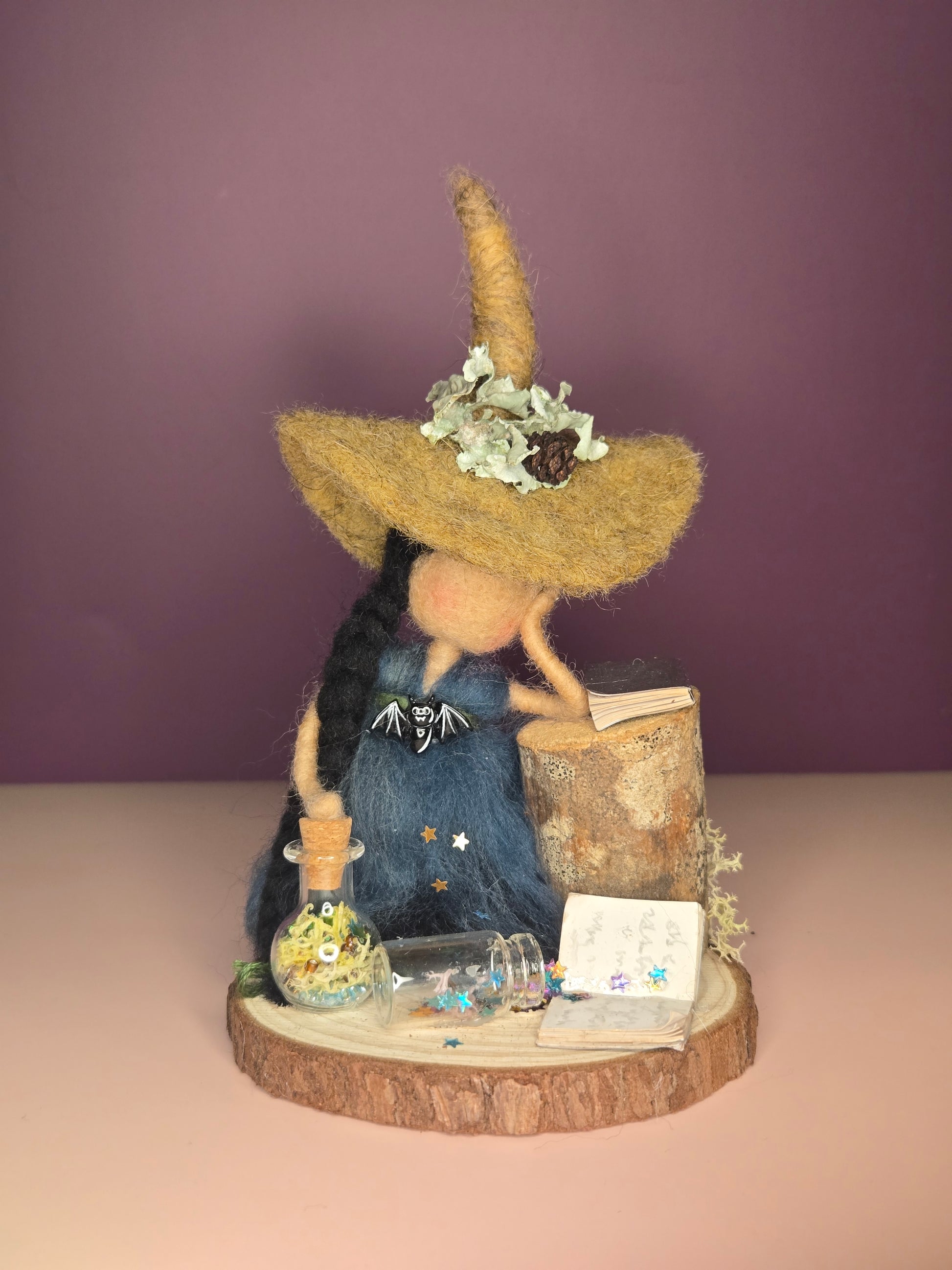 Alita sits on a wooden slice made of natural pine and treated with a shellac protection. She is made from a wire armature covered with a mix of carded and merino wool. Her dress is decorated with a small bat and also some of the potion that she has accidentally knocked over!