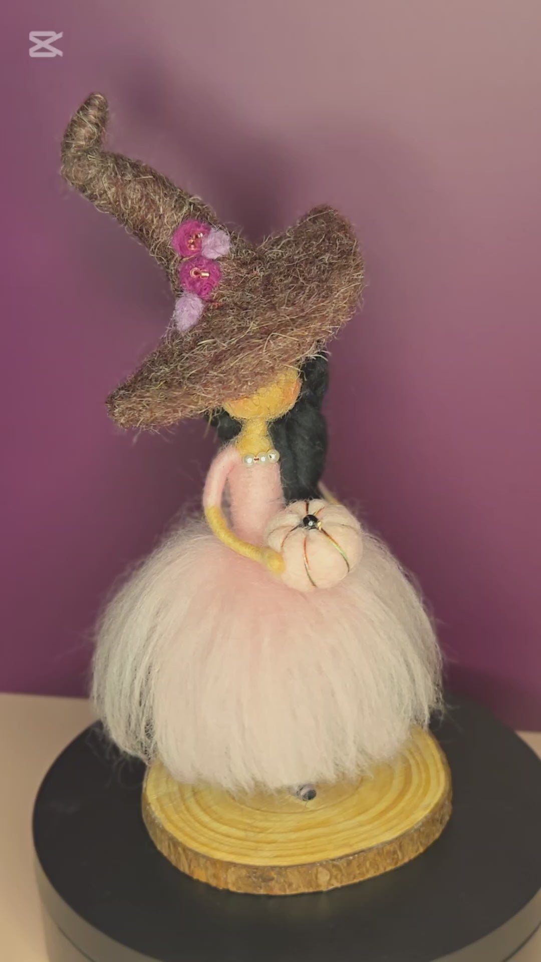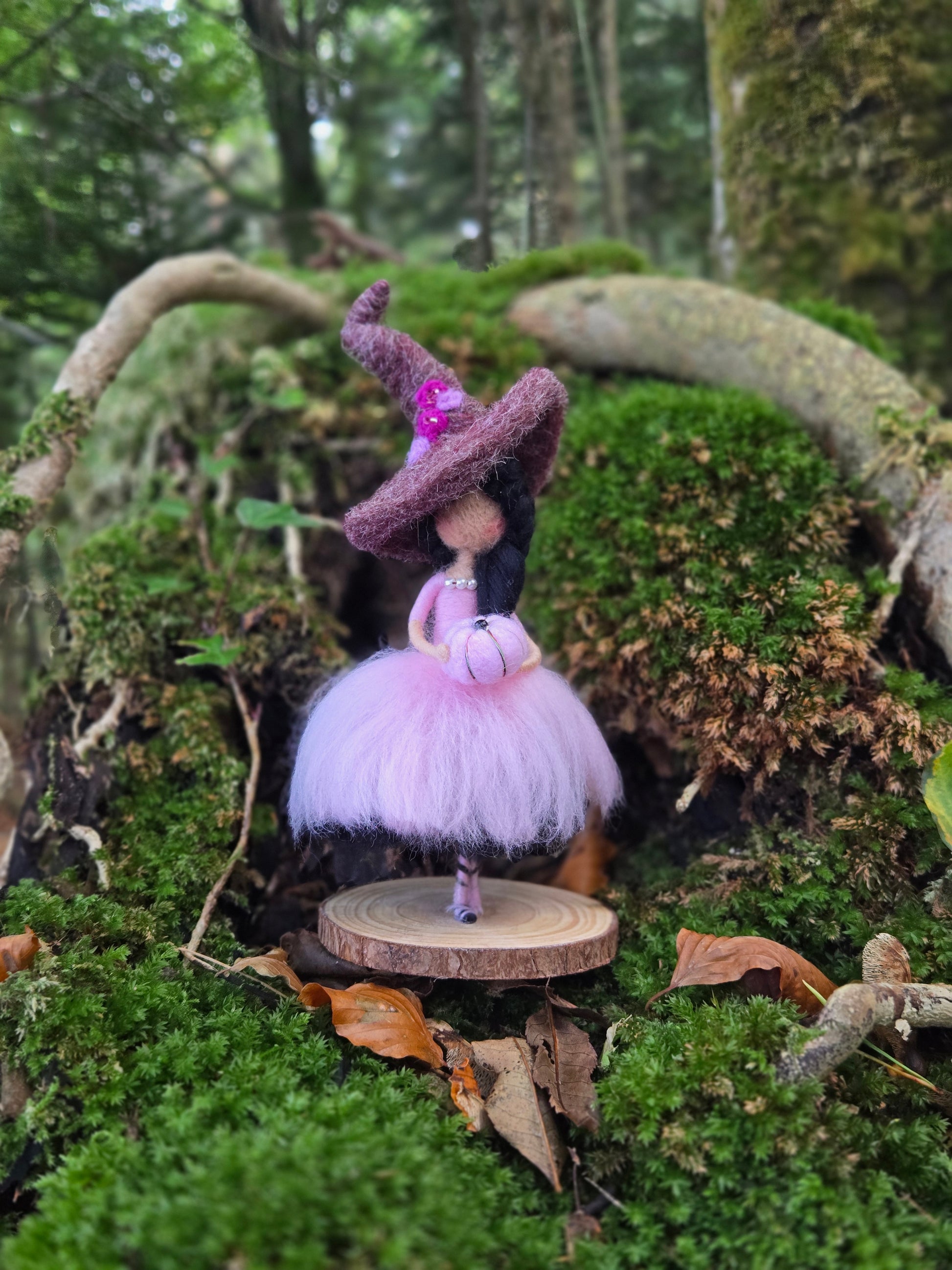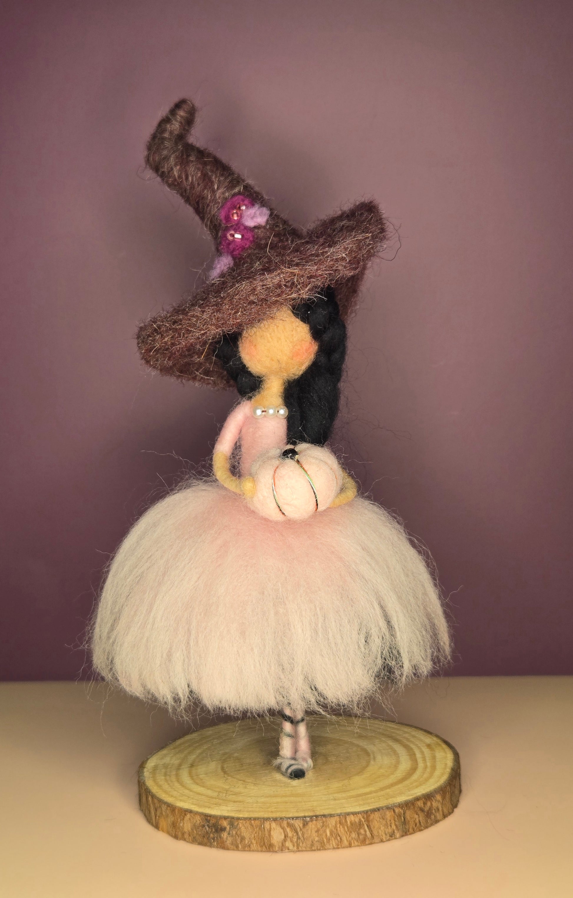 Asteria stands on a wooden slice made of natural pine and treated with a shellac protection. She is made from a wire armature covered with a mix of carded and merino wool with small beaded embellishments on her dress and carries a soft pink pumpkin.