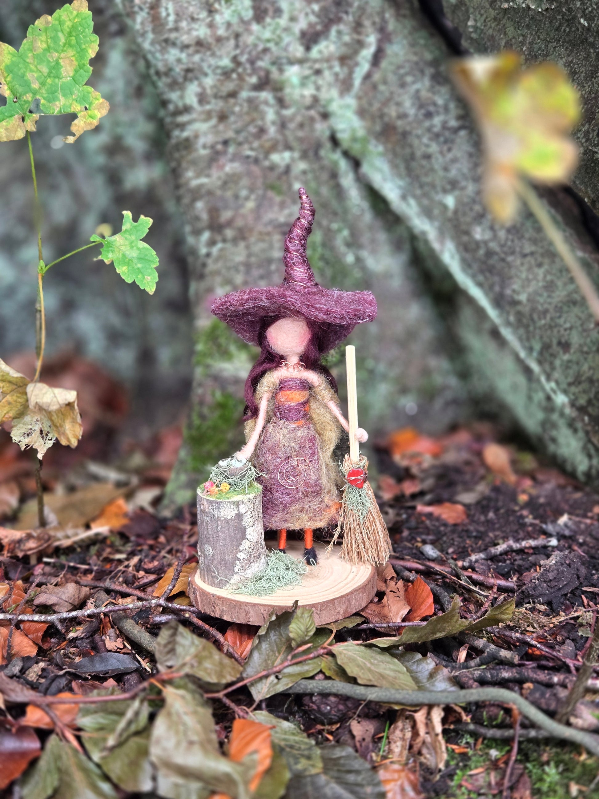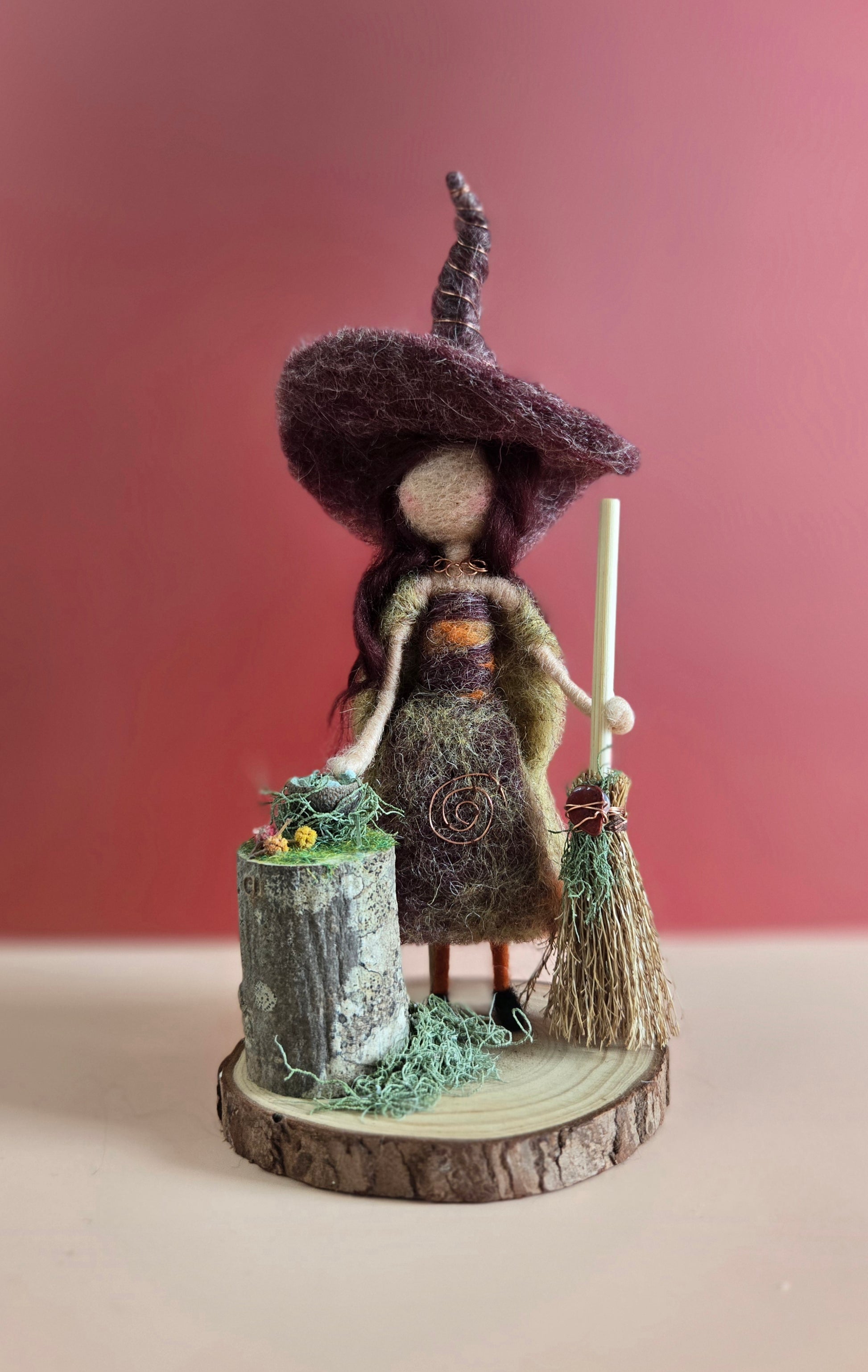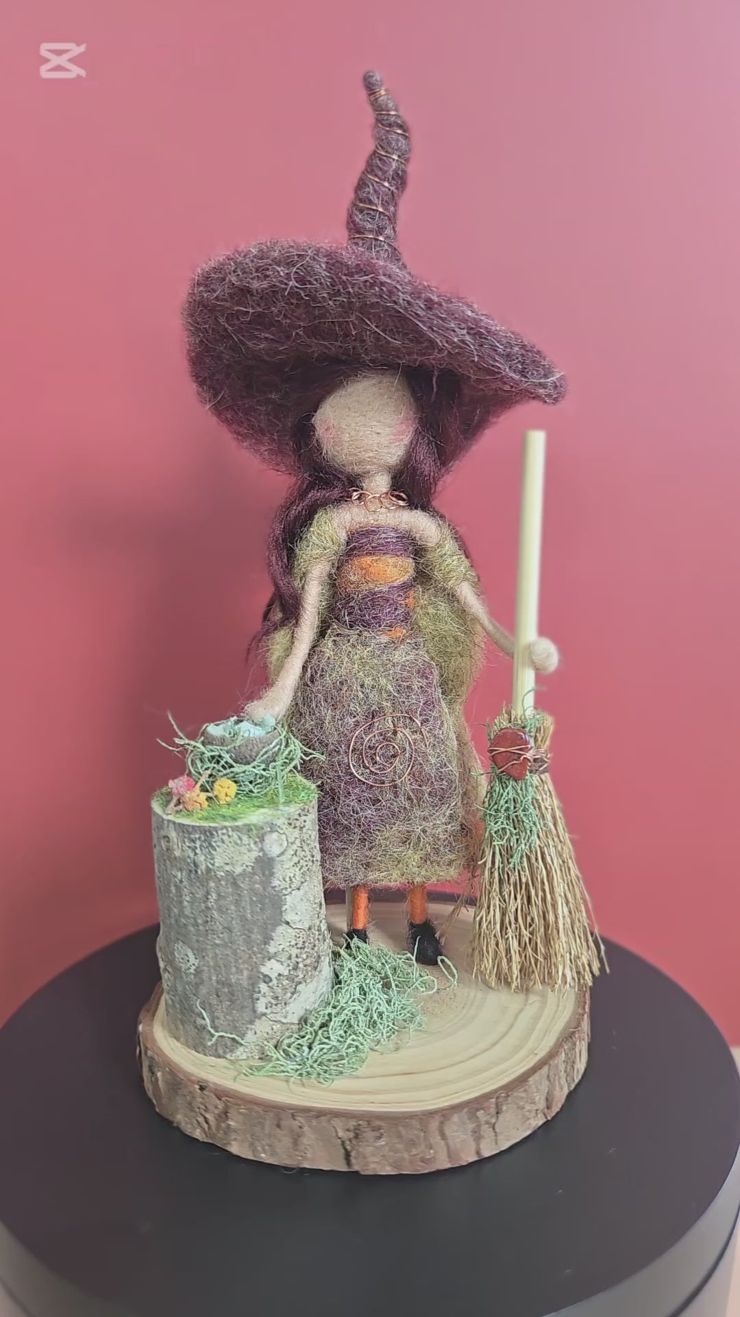 Her dress comes with a copper wire spiral attached, symbolising growth and lifes cycles used in witchcraft rituals for personal transformation. She holds her broom proudly adorned with a red jasper stone which is celebrated for its grounding energy and nurturing warmth.