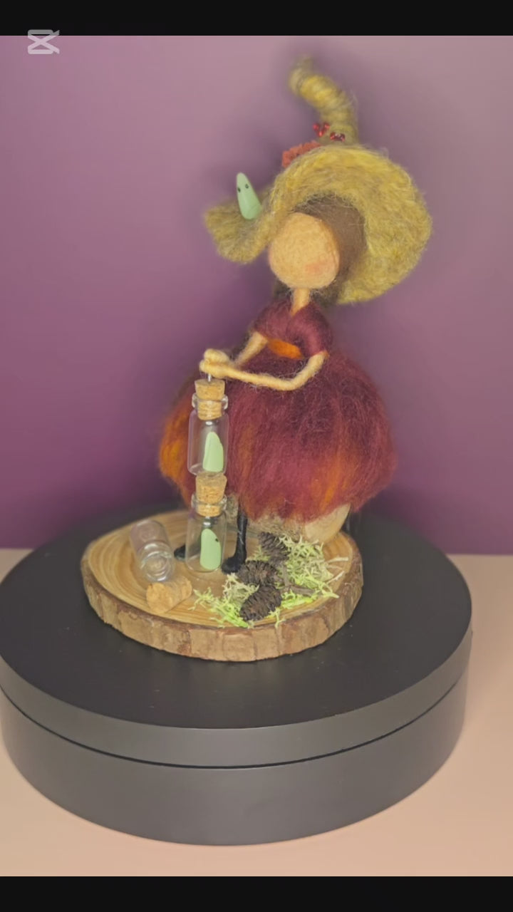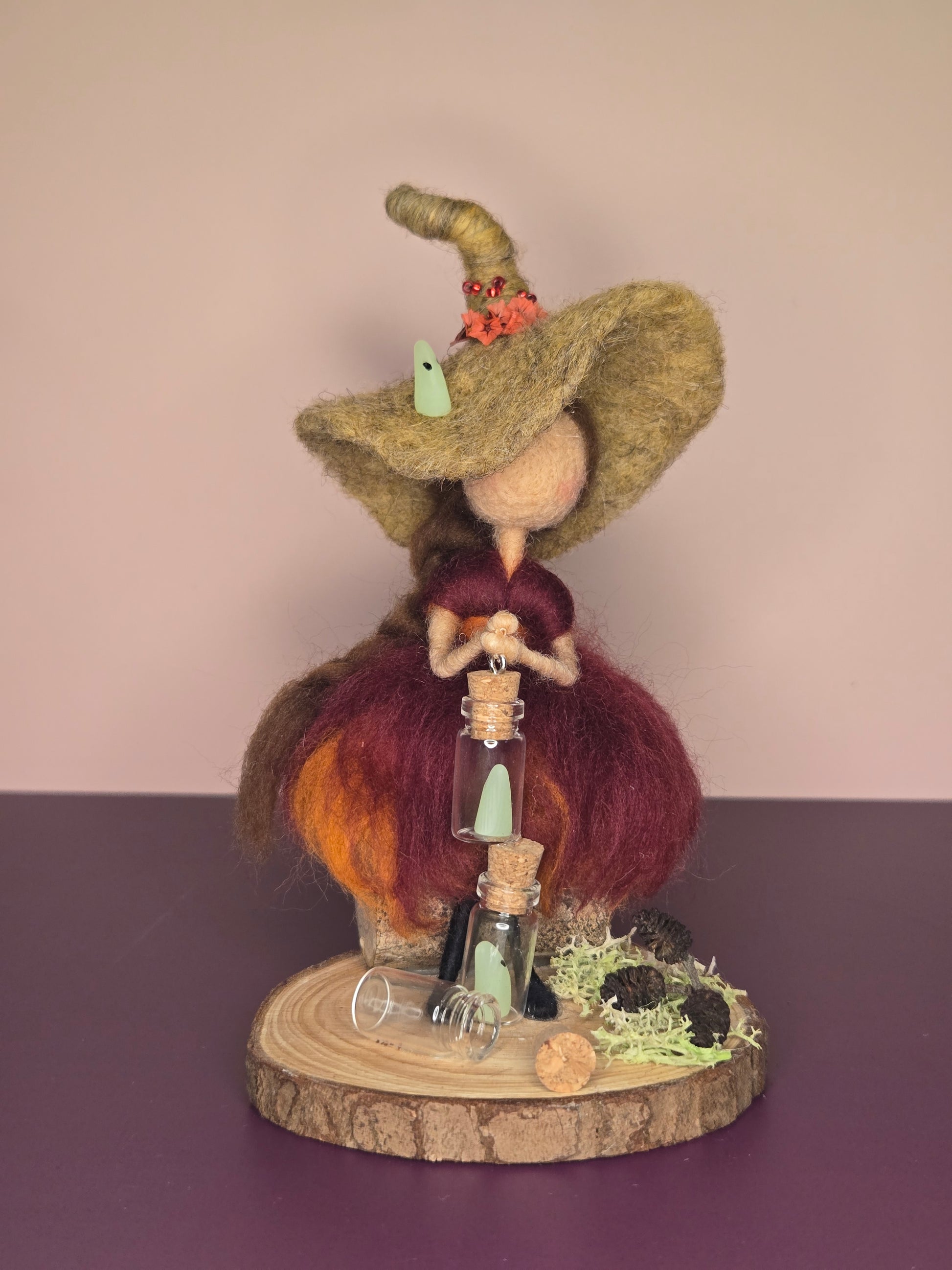Glinda sits on a wooden branch attached to a wooden slice made of natural pine and treated with a shellac protection. She is made from a wire armature covered with a mix of carded and merino wool. Accompanying her are her 3 glow in the dark friends, two of which are in glass bottles unlike Boo-dini who has escaped for a better view from her witches hat!