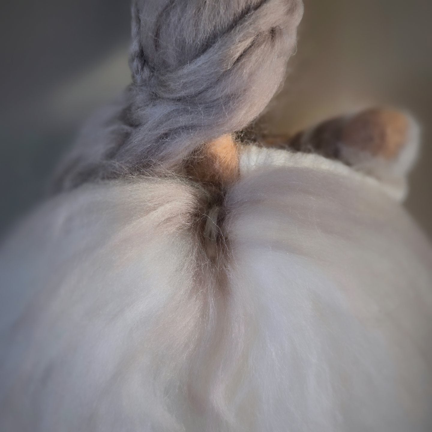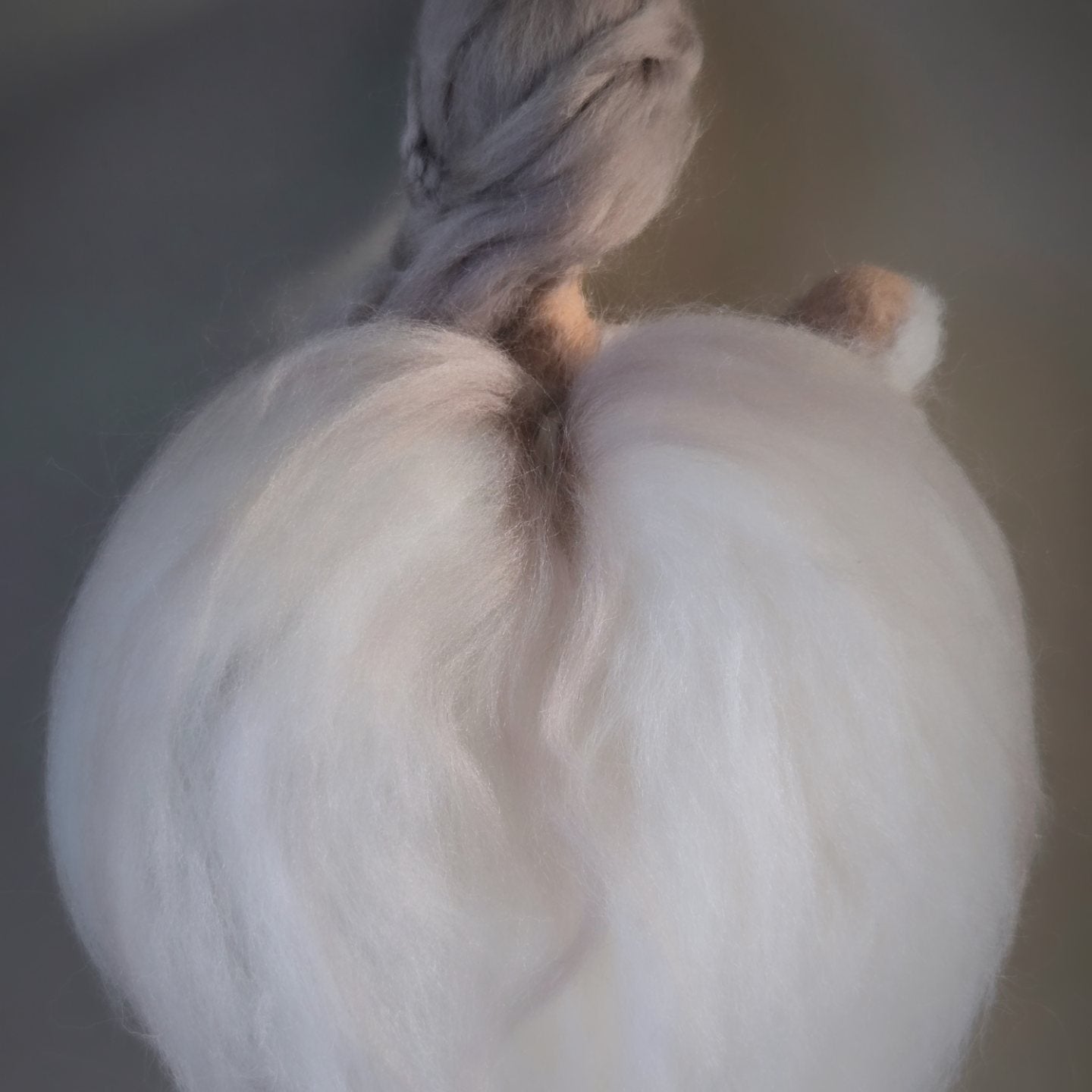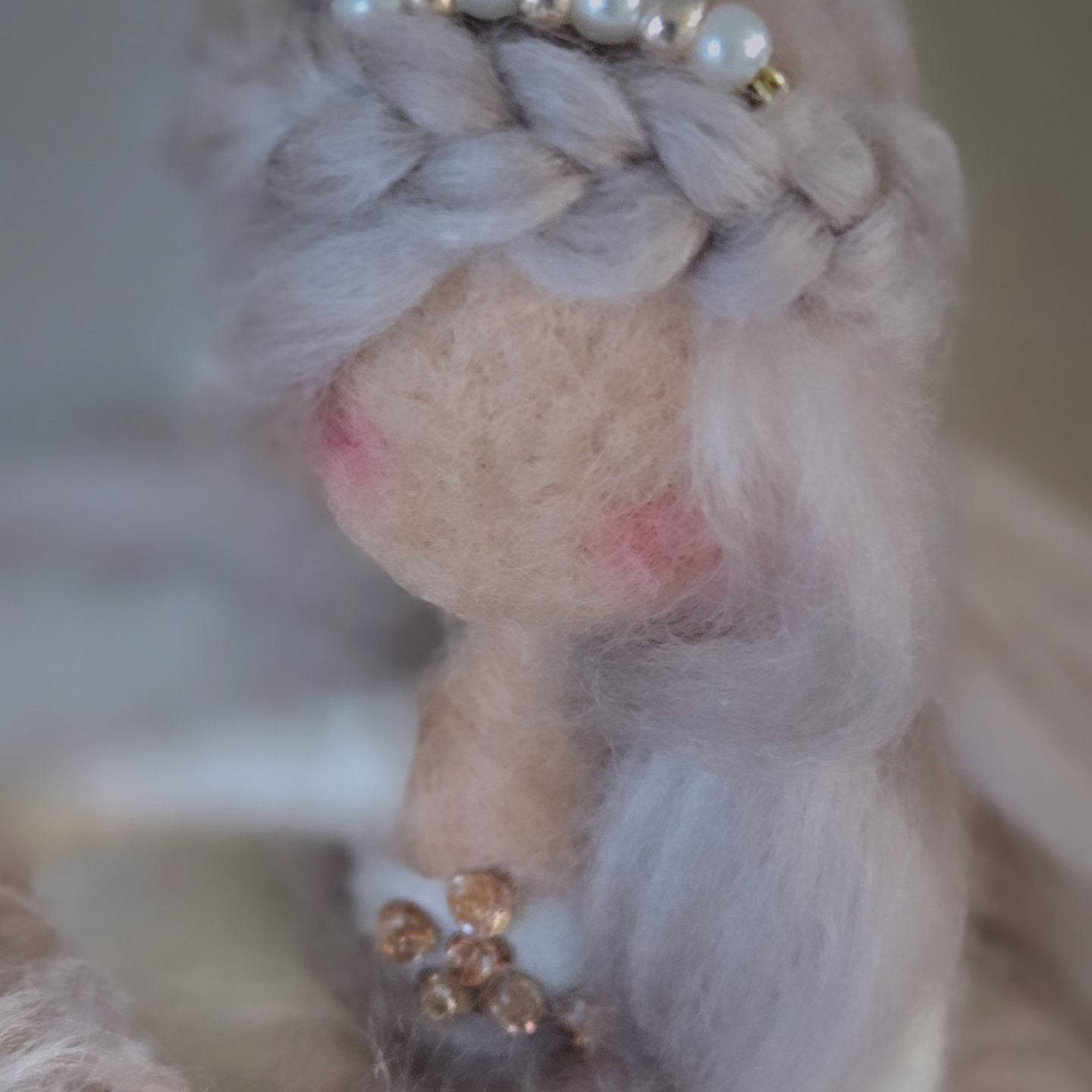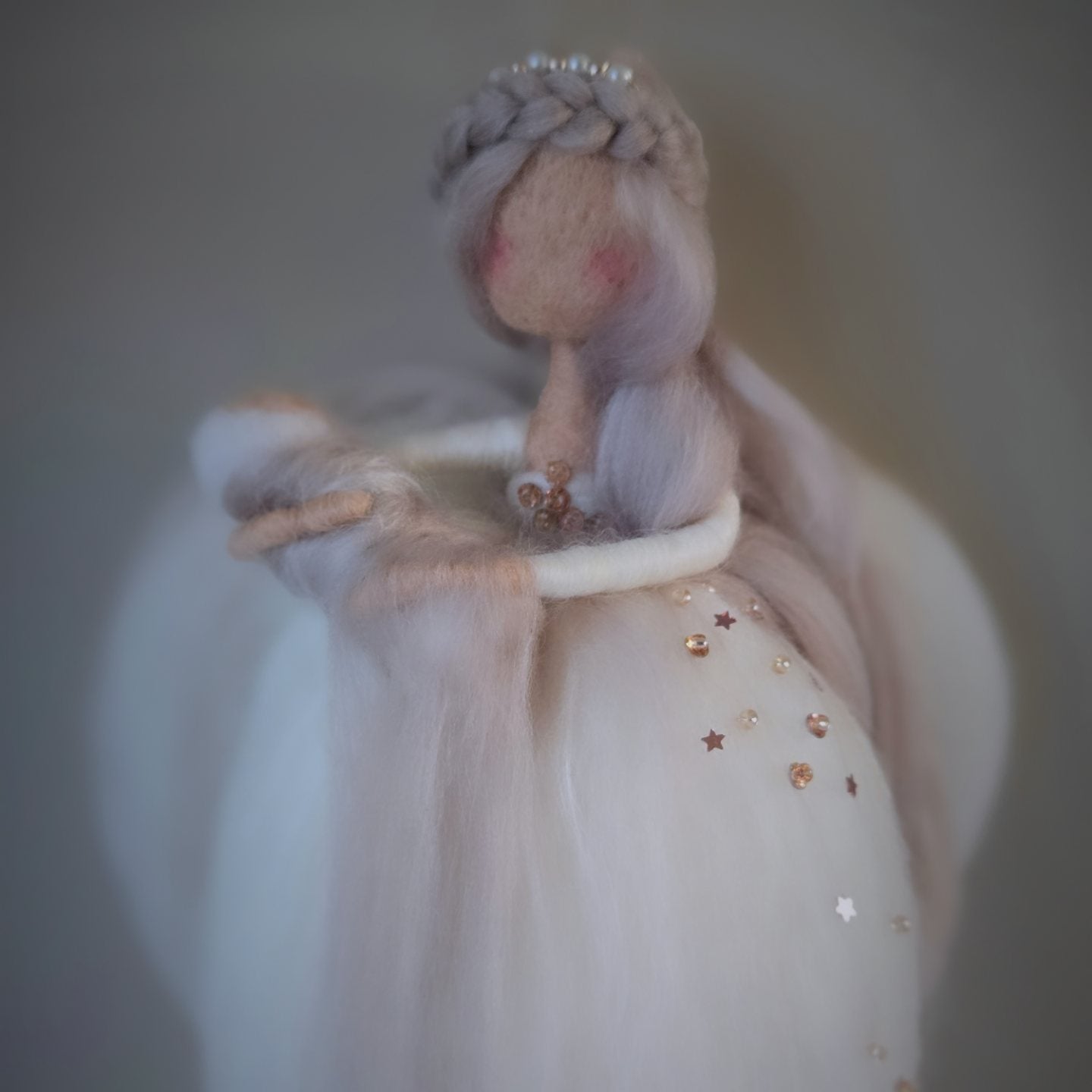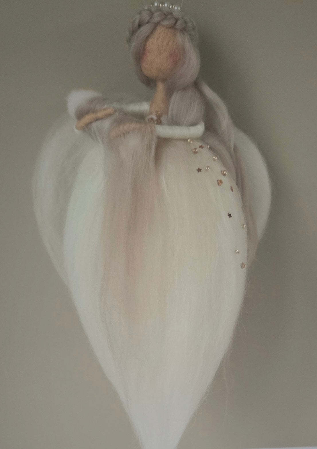 The angel is made using soft merino wool with small gold embellishments on her dress and a gold and pearl beaded band in her hair.